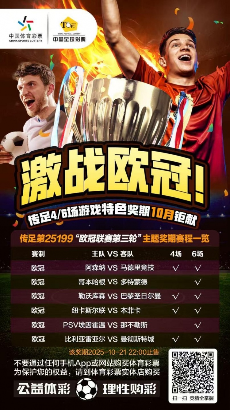 传足4/6场游戏特色奖期第25199期竞猜对象是本赛季欧洲冠军联赛的联赛阶段第三轮,具体对阵为:阿森纳VS马德里竞技、哥本哈根VS多特蒙德、勒沃库森VS巴黎圣日尔曼、纽卡斯尔联VS本菲卡、PSV埃因霍温VS那不勒斯和比利亚雷亚尔VS曼彻斯特城。