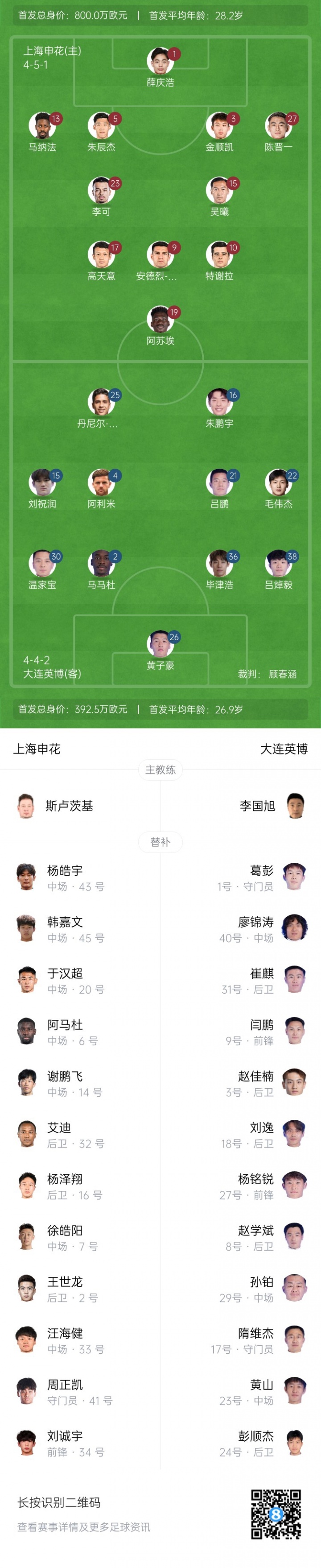 上海申花首发:1-薛庆浩、3-金顺凯、5-朱辰杰、13-马纳法(F)、27-陈晋一、15-吴曦、17-高天意、23-李可、9-安德烈-路易斯(F)、10-特谢拉(F)、19-阿苏埃(F)