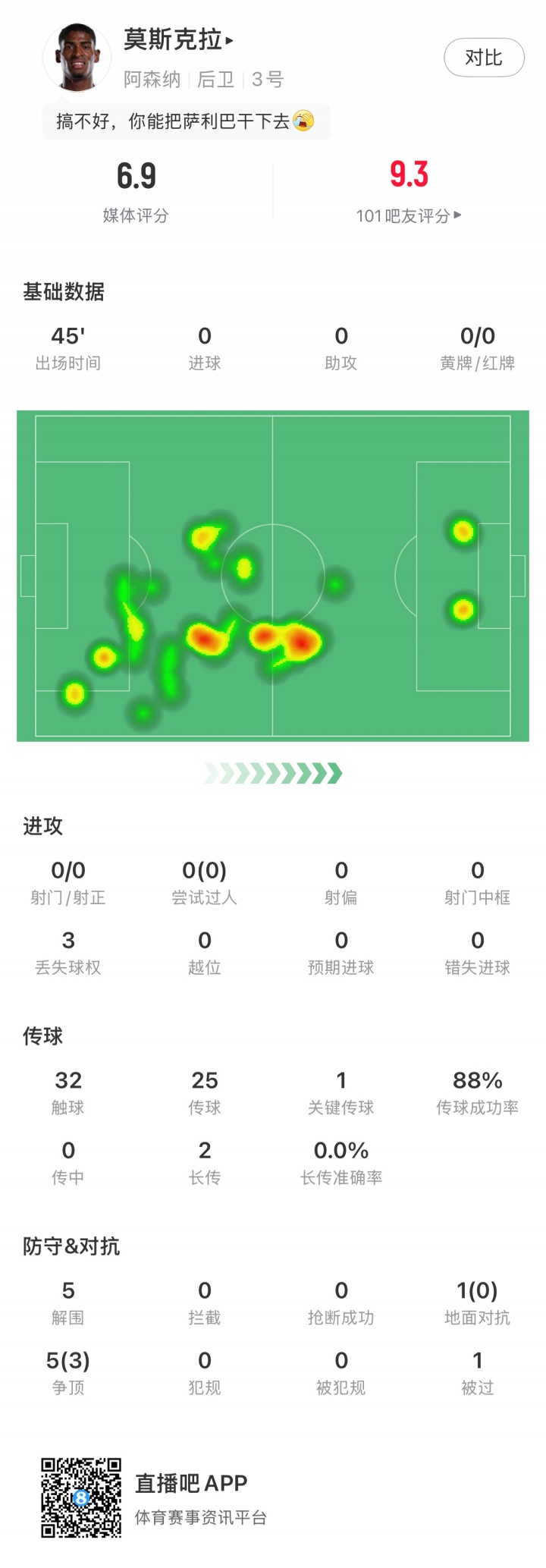 赛后数据显示,莫斯克拉出战45分钟,只丢失3次球权,25脚传球成功率88%,并且还贡献了1次关键传球,5次解围以及3次成功争顶。