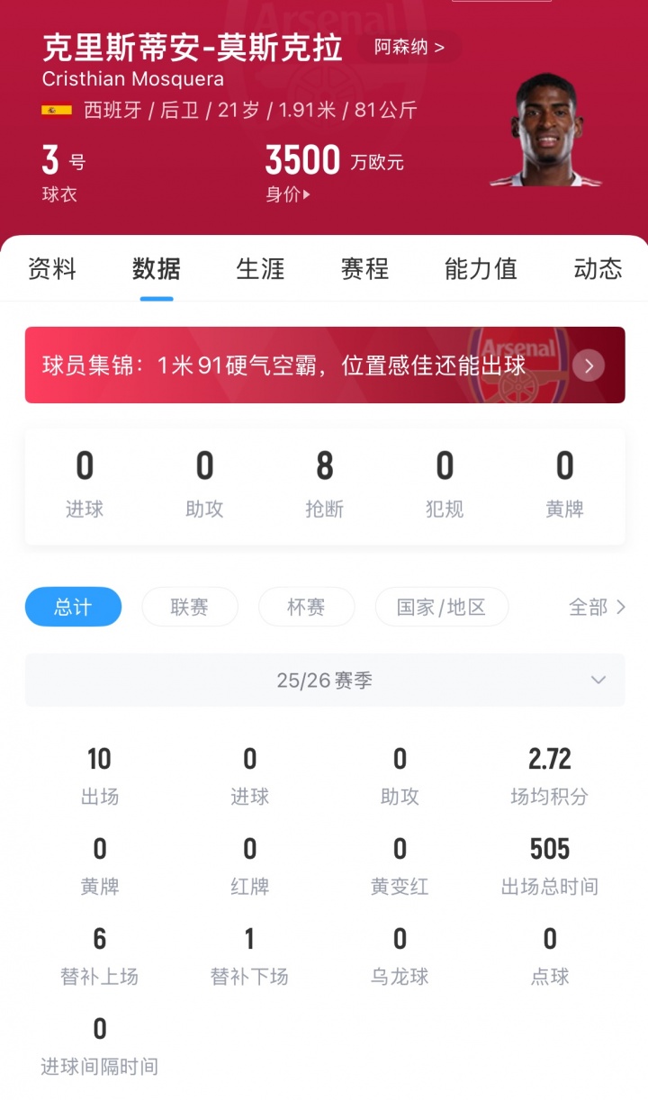 今夏阿森纳仅以1500万欧就从瓦伦西亚引进了莫斯克拉,本赛季至今,他代表阿森纳出战10场各项赛事,其中6次替补登场,以稳健的表现填补了阿森纳防线的阵容厚度。目前莫斯克拉的德转身价为3500万欧。