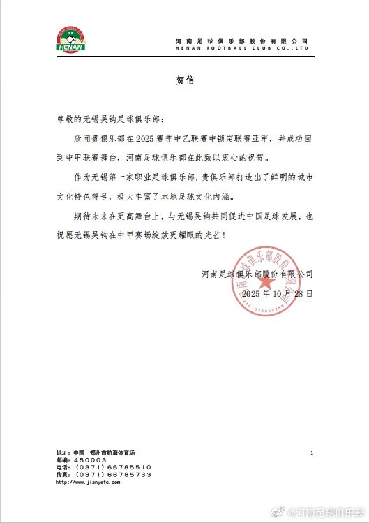 欣闻无锡吴钩俱乐部在2025赛季中乙联赛中锁定联赛亚军,并成功回到中甲联赛舞台,河南足球俱乐部在此致以衷心的祝贺。