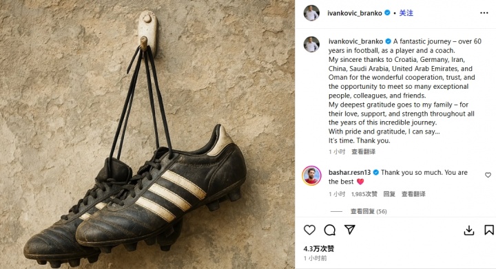 10月30日讯 71岁前国足主帅伊万科维奇在社媒发文,正式宣布退休,他表示自己以球员和教练身份驰骋足坛逾六十载,是时候该别足坛了。