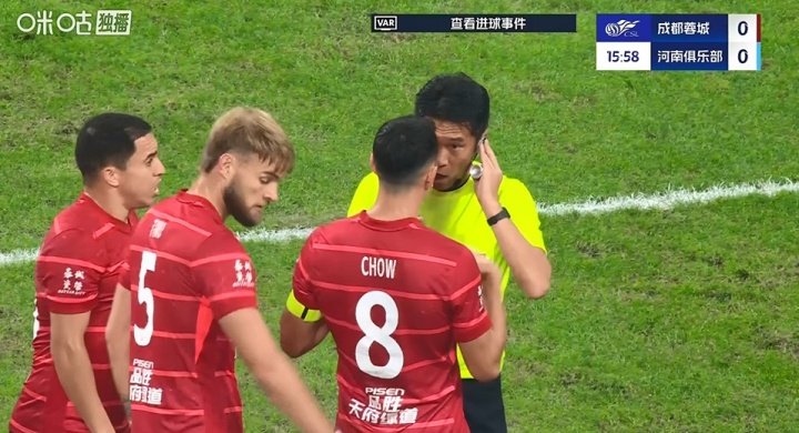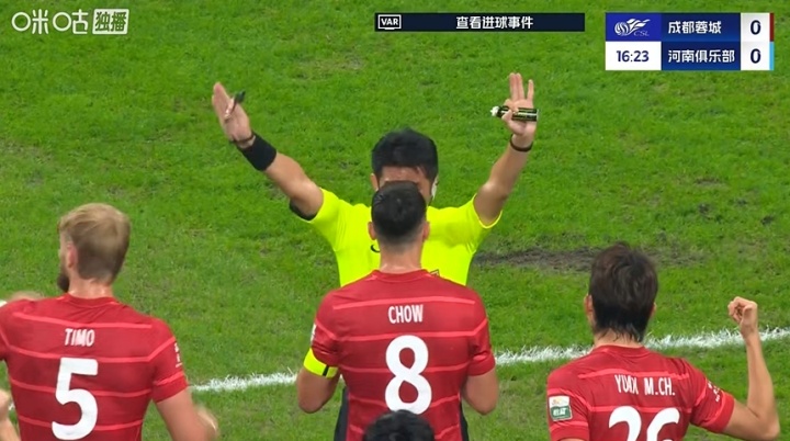 胡荷韬破门,但裁判认定河南队手球在先进球无效,判给蓉城定位球。随后蓉城教练组抗议吃到黄牌。