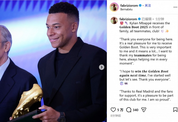 姆巴佩领取欧洲金靴:感谢队友、皇马和球迷,我们能赢得很多冠军