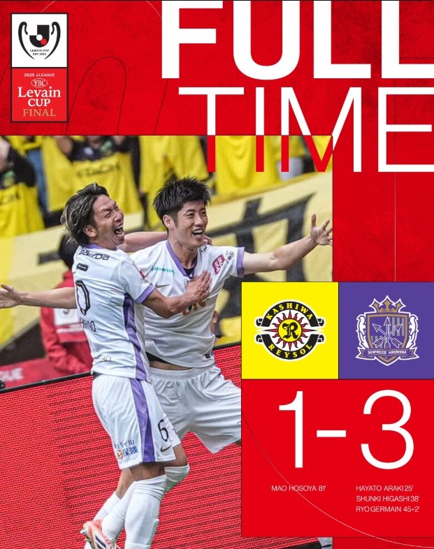 2025年J联赛杯决赛今天在东京国立竞技场进行,广岛三箭vs柏太阳神,广岛三箭依靠荒木隼人、东俊希以及杰梅恩-良的进球3-1战胜柏太阳神夺冠,细谷真大为柏太阳神进球。