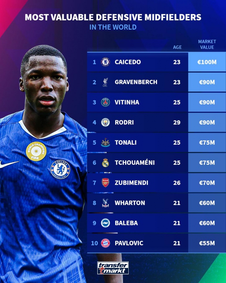 11月2日讯 德国转会市场列出了防守型中场身价排名,凯塞多以1亿欧居首。