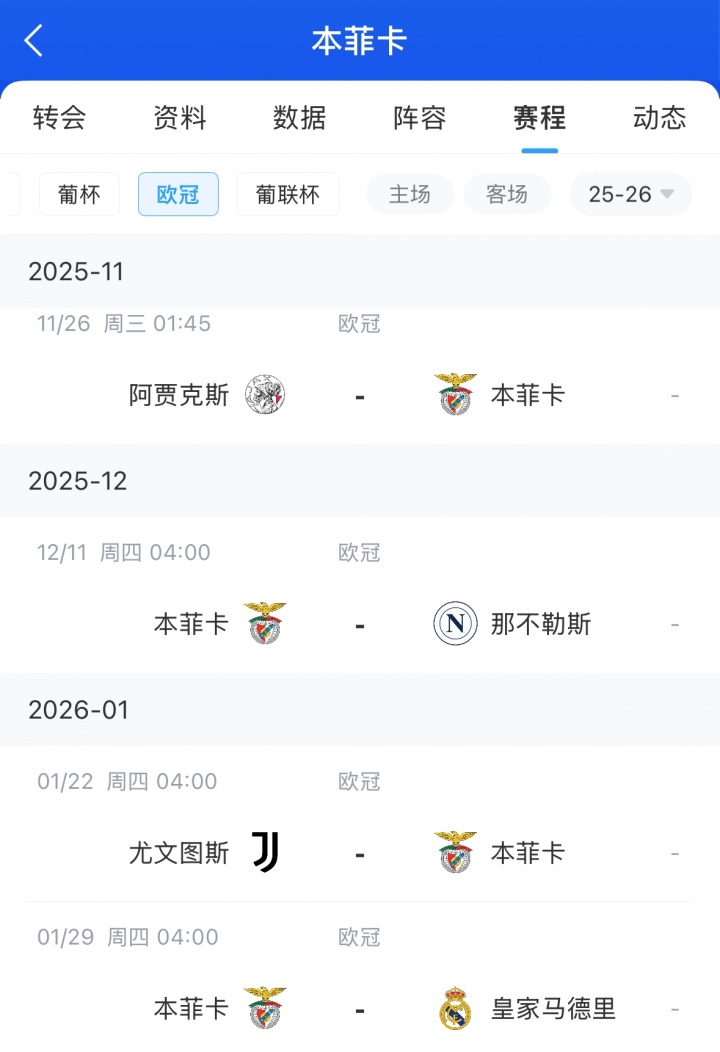 接下来欧冠四场,本菲卡还将面对包括那不勒斯、尤文及皇马。只有阿贾克斯与本菲卡处境类似,两队都四连败。