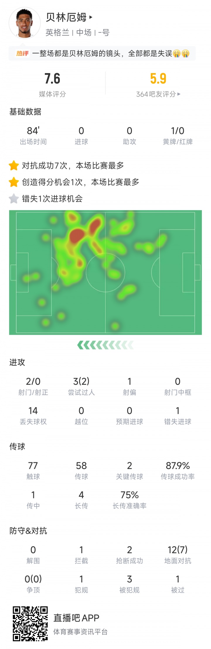 控球数据方面,77次触球14次丢球权,87.9%的传球成功率。贝林赛后评分7.6分,全场第3。双响的凯恩8.8分,评分第1,丹·伯恩7.8分第2。