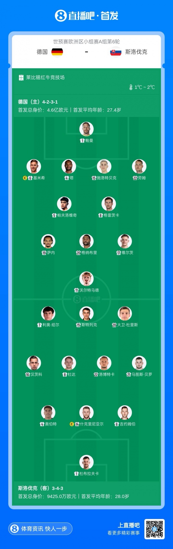 11月18日讯 世欧预A组第6轮,德国迎战斯洛伐克比赛即将打响,赛前首发出炉。本场是A组前二的末轮直接对话,两队本场赛前同分,将争夺头名。